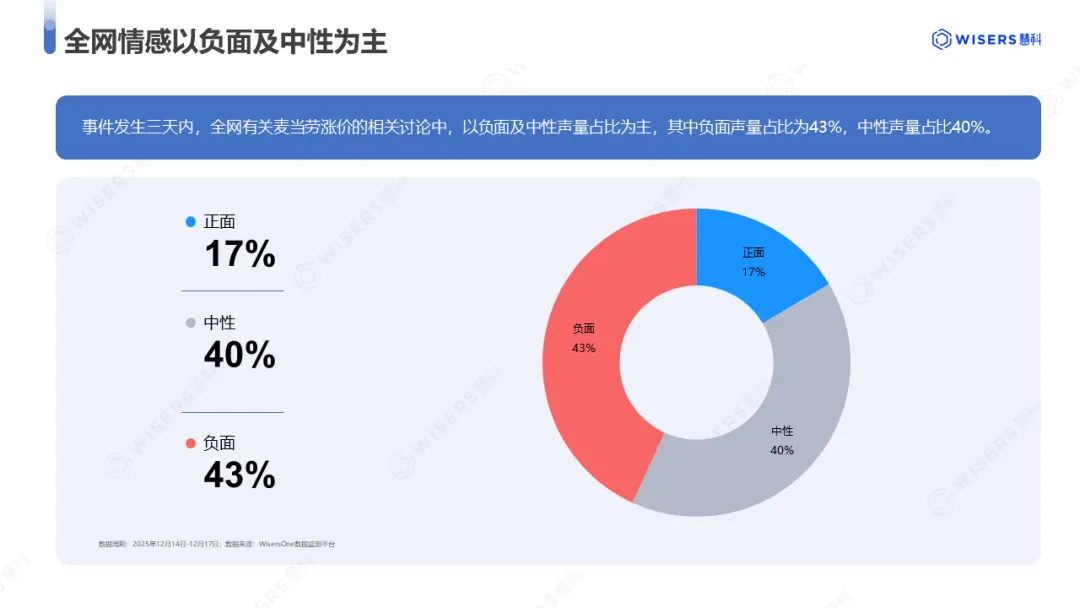 然而,官方的及时回应似乎并未遏制消费者的不满情绪,事件整体情绪仍以负面为主。WisersOne数据显示,事件发生三天内,全网有关麦当劳涨价的相关讨论中,以负面及中性声量占比为主,其中负面声量占比为43%,中性声量占比40%。